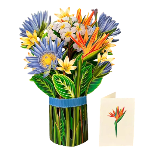 A journey of color and design, this whimsical Tropical Bloom bouquet evokes the promise of the future. Showcasing Birds of Paradise representing optimism, Lotus blossoms symbolizing rebirth and Plumeria for hope, this bouquet will uplift