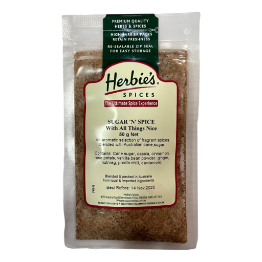 Herbie’s Spices Sugar ‘n’ Spice is an aromatic selection of fragrant spices carefully blended with Australian cane sugar. Sprinkle on hot buttered toast to enjoy a deluxe cinnamon toast experience!