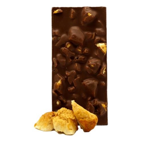 Sweet and decadent, this Milk Chocolate Hunter Valley Honey Comb bar is a perfect blend of crunchy golden Hunter Valley honeycomb bites and rich 36% cacao milk chocolate. Handcrafted and made by the finest of local ingredients, this chocolate bar makes a perfect snack time option and a great gift for your loved ones. Ingredients: Cocoa Mass, Evaporated Cane Sugar, Full Cream Milk Powder, Cocoa Butter, Emulsifier (Soy Lecithin), Vanillin, Honeycomb (Caster Sugar, Glucose, Water, Gelatin, Bicarbonate Soda) May contain traces of other tree nuts, peanuts, gluten, berries, dairy. Handcrafted in Sydney